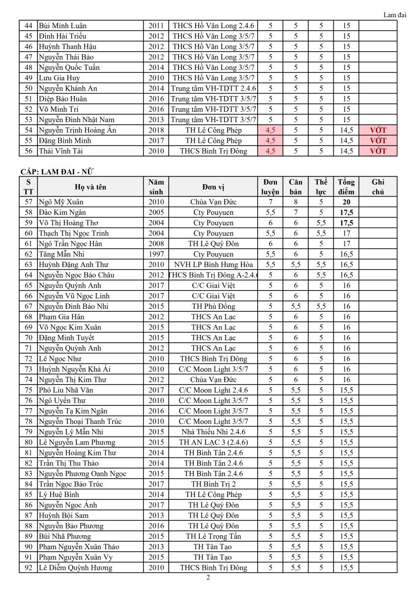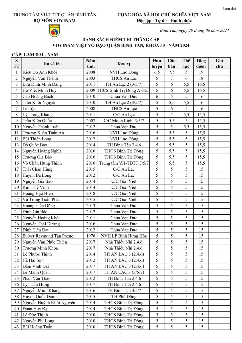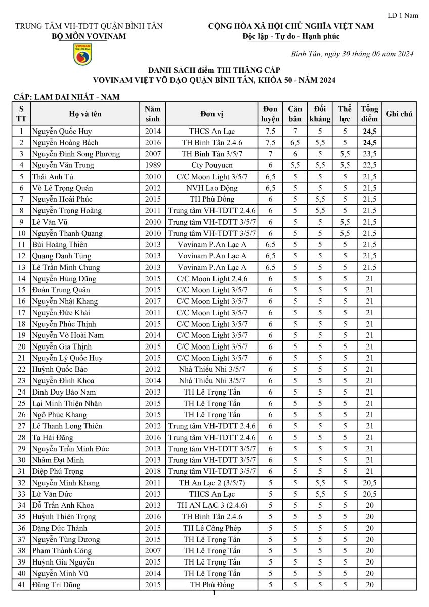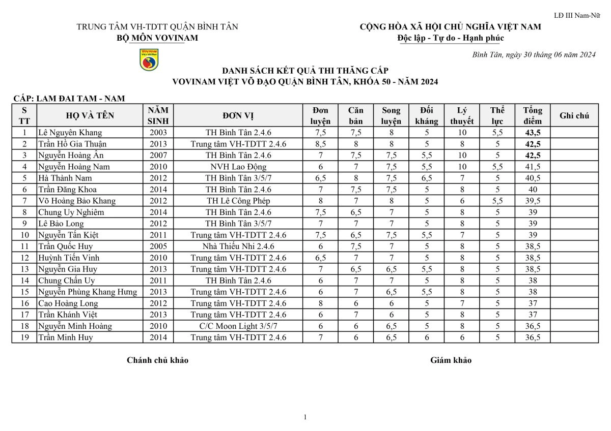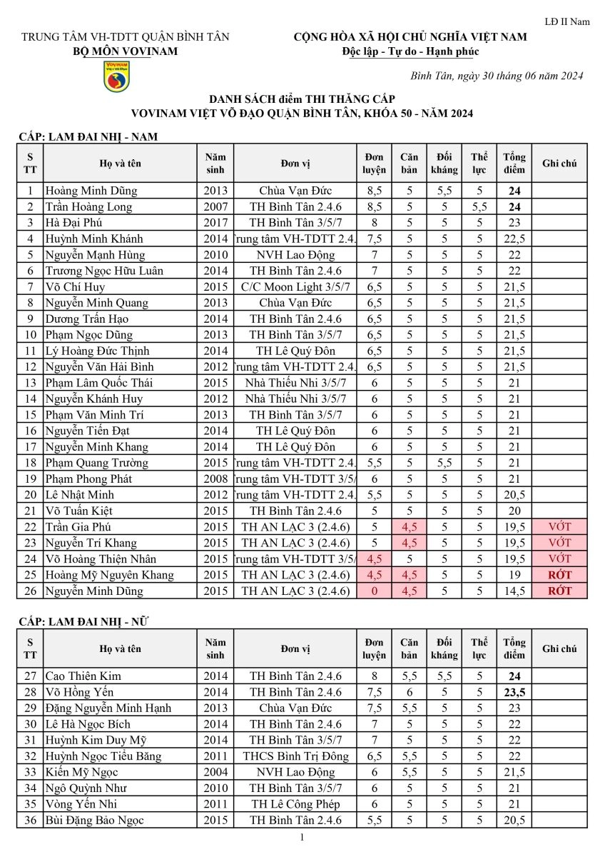 Kết quả kì thi thăng cấp Vovinam Quận Bình Tân K50-2024