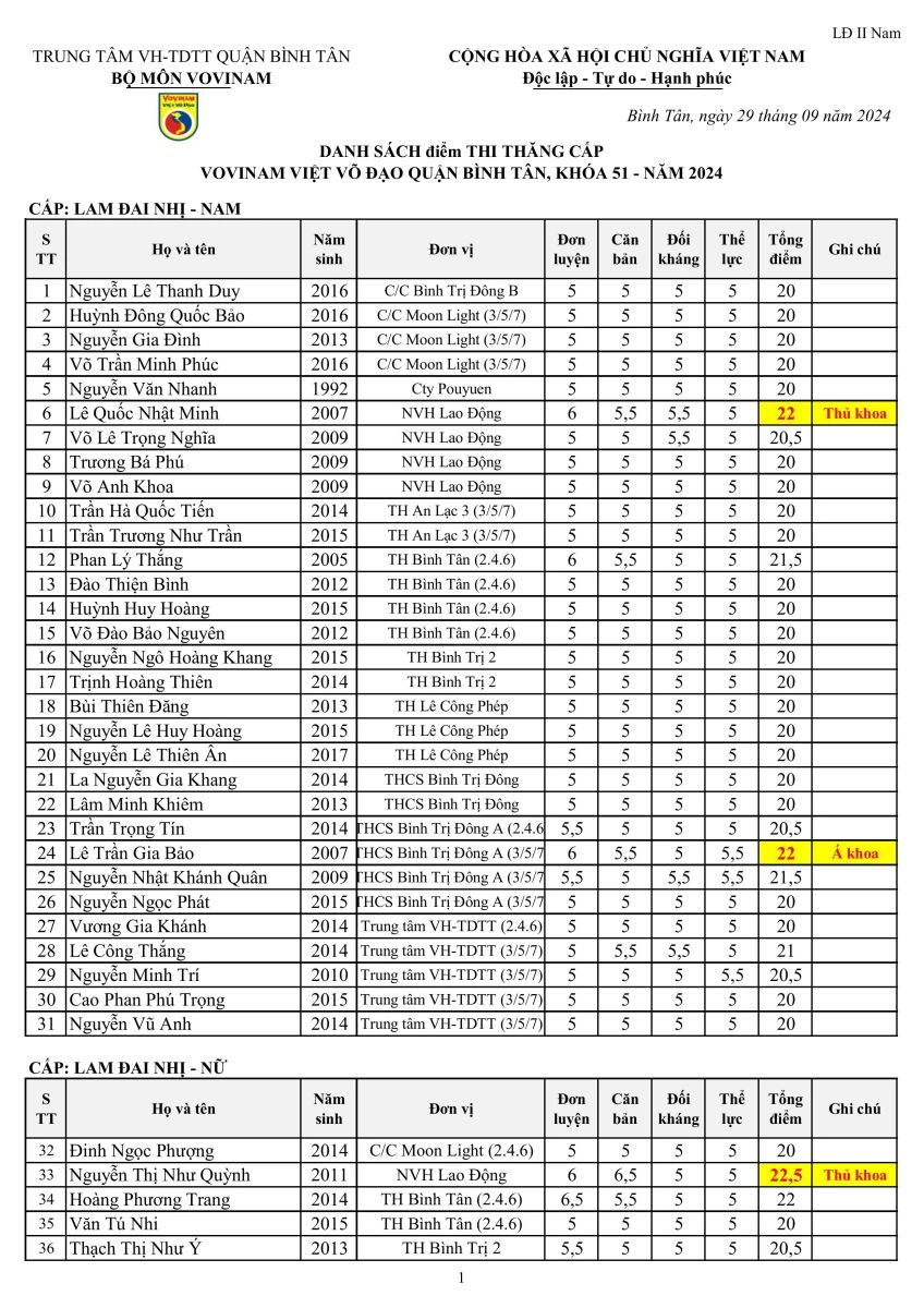 Kết Quả Kì Thi Thăng Cấp Vovinam Quận Bình Tân K51-2024