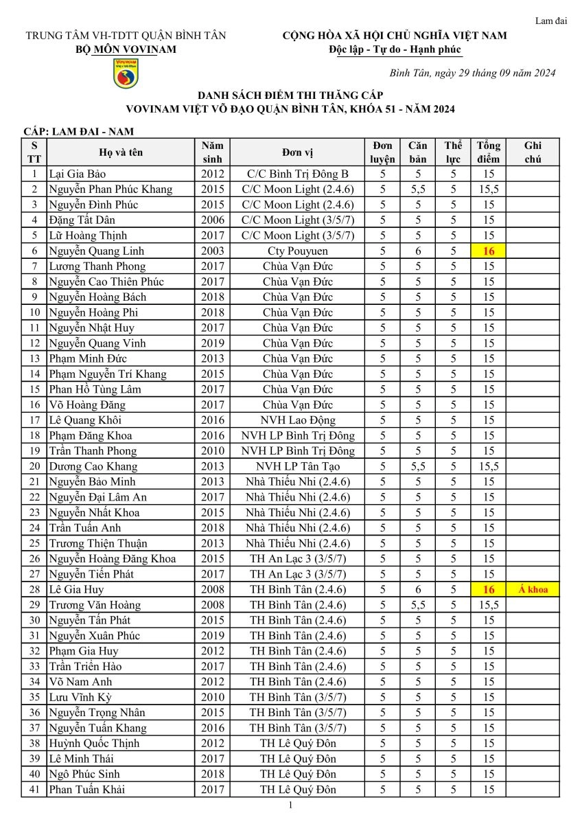 Kết quả kì thi thăng cấp Vovinam Quận Bình Tân K51-2024